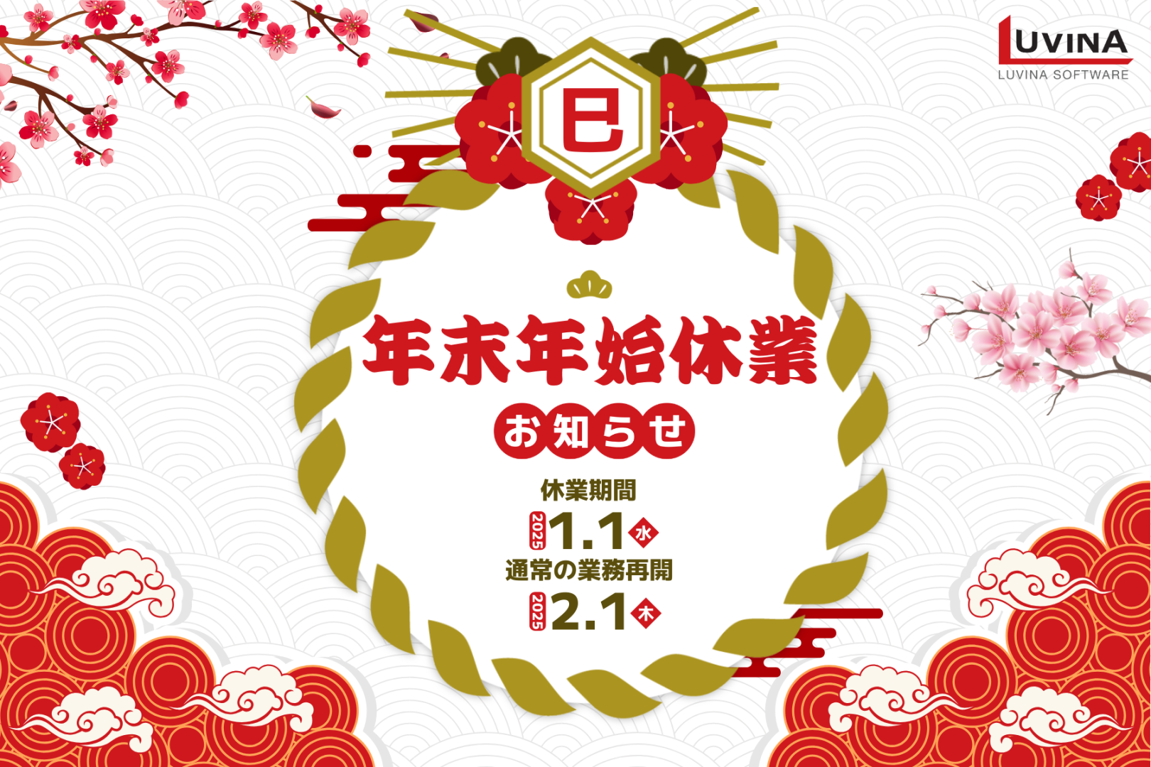 お客様、パートナーの皆様へ 平素はひとかたならぬご厚情にあずかり、心から御礼申し上げます。   ルビナソフトウェアでは以下の期間を年末年始休業とさせていただきます。 ご迷惑をおかけしますが、ご了承のほどよろしくお願いします。   ーーーーーーーーーーーーーーーーーーーーーーーーーーーーーーーーーーーーーーーーーー 年末年始の休業日 年末年始の休業期間:2025年1月1日 (水) 通常の業務再開:2025年1月2日(木) ※ 緊急のご用件がございましたら、以下のメールアドレスまでご連絡ください。 ⬇️メール:info@luvina.jp     ーーーーーーーーーーーーーーーーーーーーーーーーーーーーーーーーーーーーーーーーーー 去年もルビナをサポートしていただきありがとうございました。 今後もご支援とご協力を心よりお願い申し上げます。 素敵な時間をお楽しみいただき、暖かく幸せな新年をお迎えください! ルビナソフトウエア株式会社