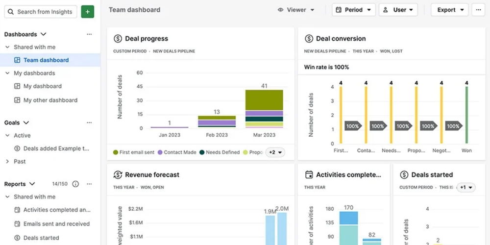 Pipedriveは、営業プロセスの可視化と案件管理に特化したCRMソフトウェアで、ドラッグ&ドロップで直感的に操作できるビジュアルパイプライン機能により商談の進捗状況を一目で把握でき、反復タスクの自動化とAI駆動の分析による商談成功率予測や優先順位付けを実現します。シンプルで学習コストが低い操作性と優れたコストパフォーマンスにより、営業活動の効率化を最優先課題とする企業やパイプライン管理を強化したい中小企業、使いやすさを重視する営業チームに最適なソリューションとなっています。