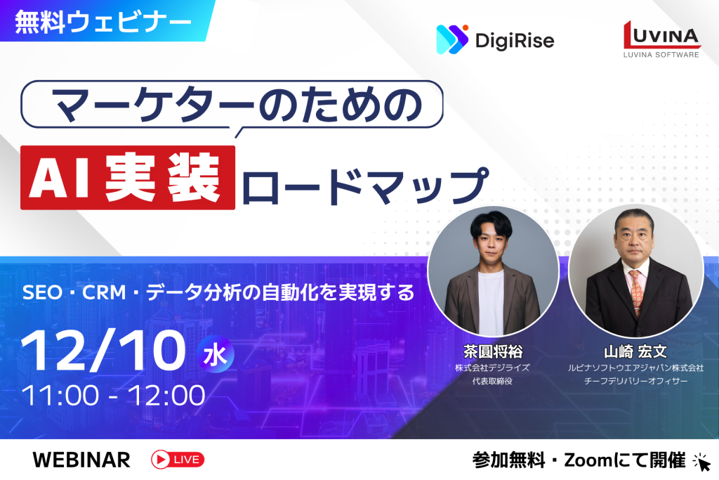 ルビナソフトウエア(本社:ハノイ、ベトナム)は2025年12月10日(水)に、株式会社デジライズとの2社共催で、ウェビナー「マーケターのためのAI実装ロードマップ ~SEO・CRM・データ分析の自動化を実現する」を開催いたします。